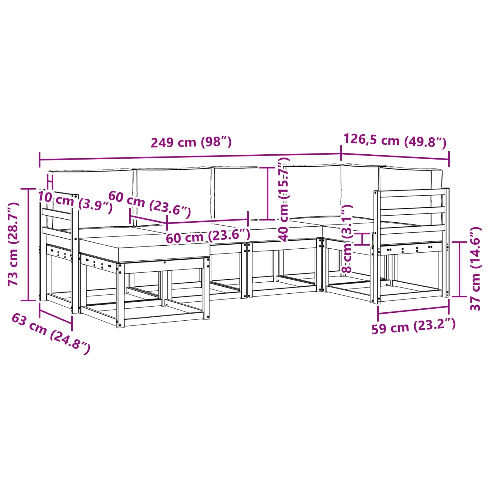 - 2 x Naslon: 59 x 4 x 73 cm (D x Š x V)