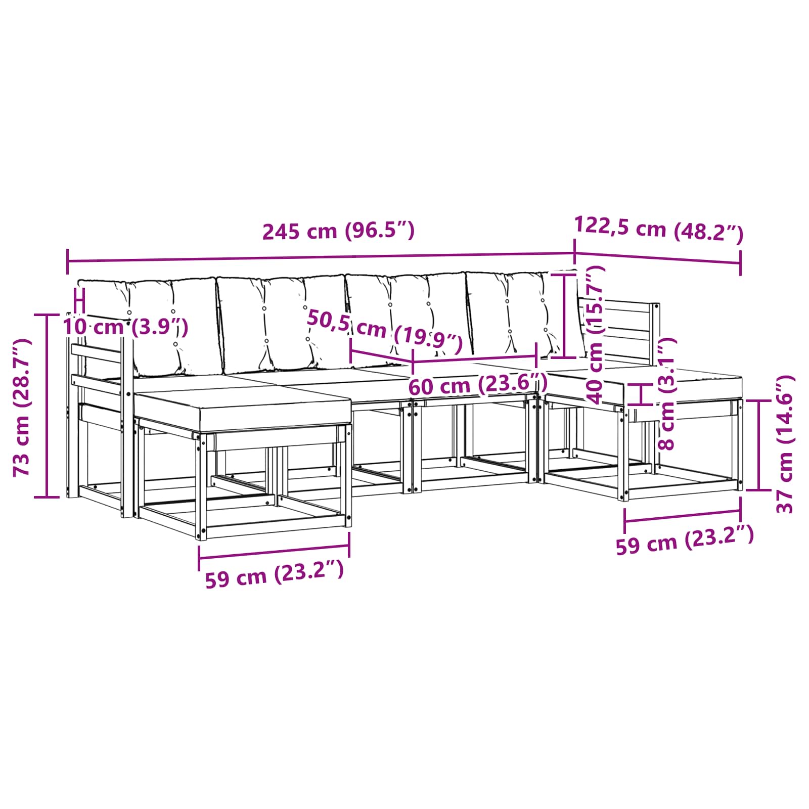 - 4 x Srednji Sofe: 59 x 63 x 73 cm (D x Š x V)